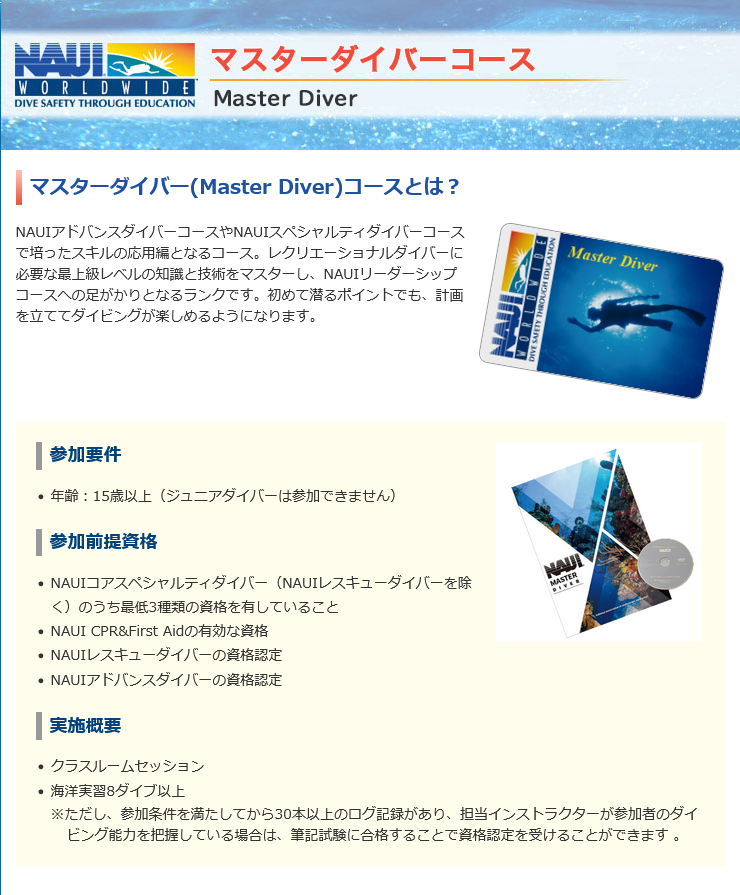 | 参加資格 | 満15歳以上の健康な方(ジュニアダイバーは受けれません) NAUI CPR&FirstAid の有効な資格 |