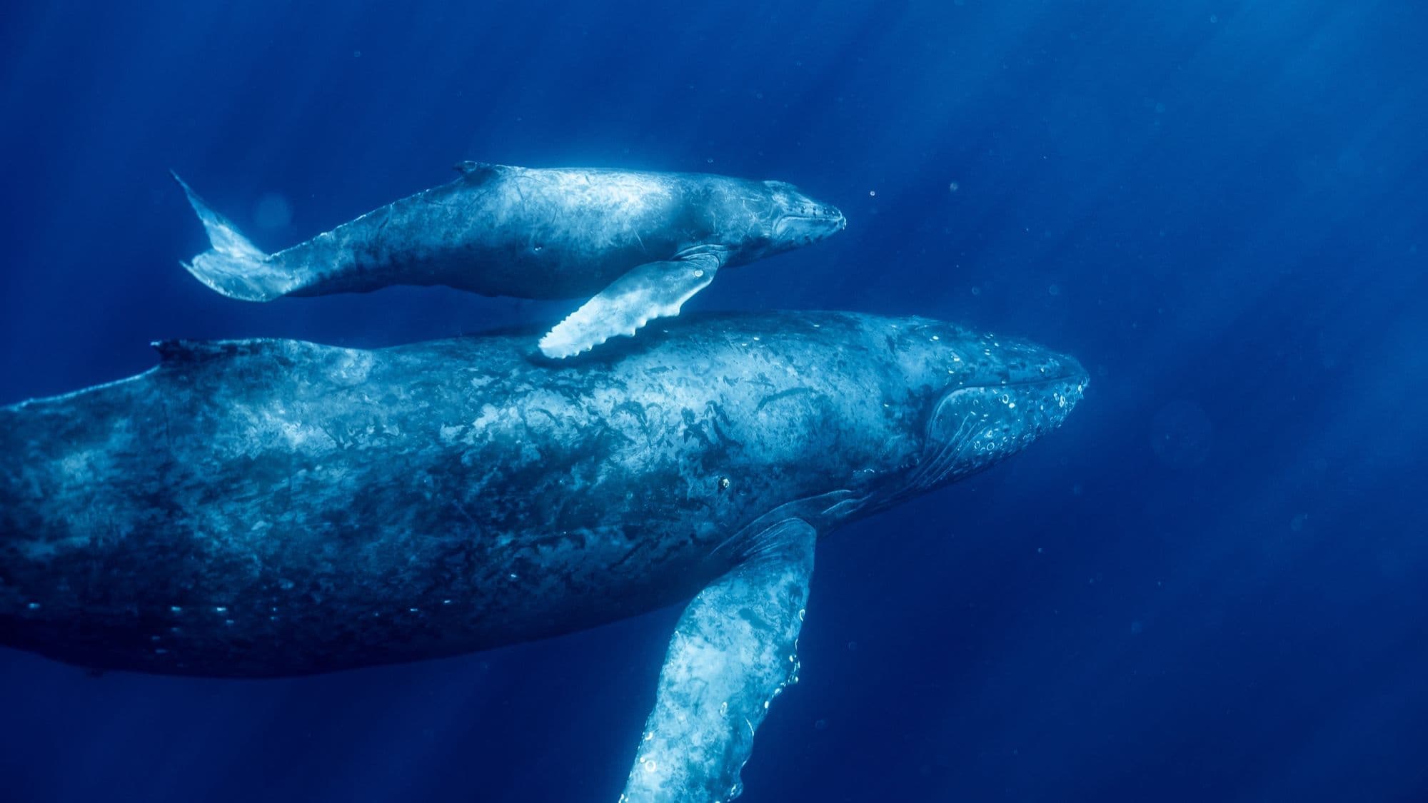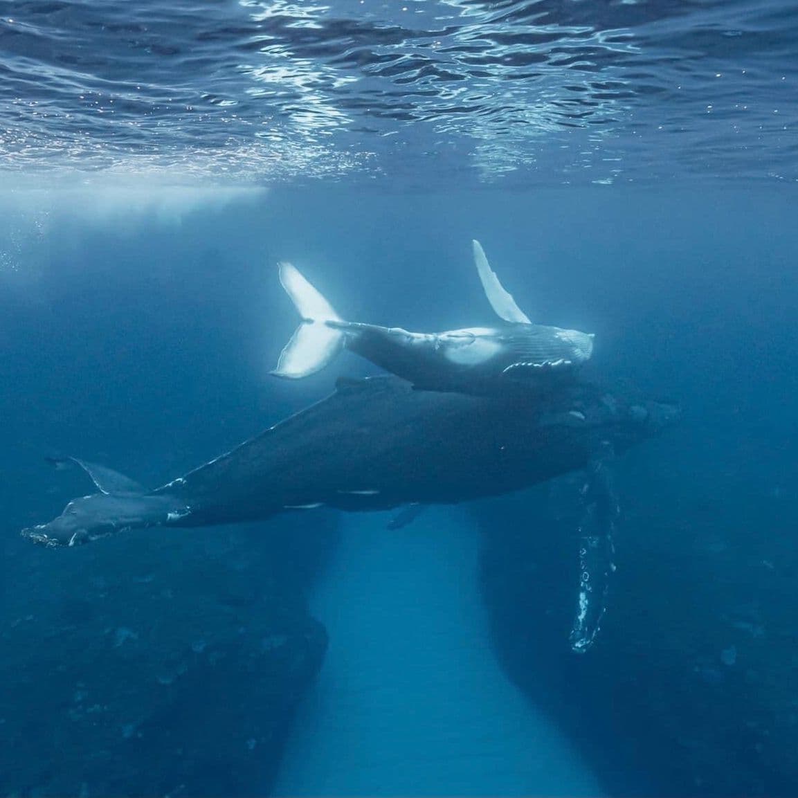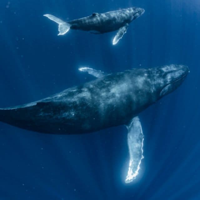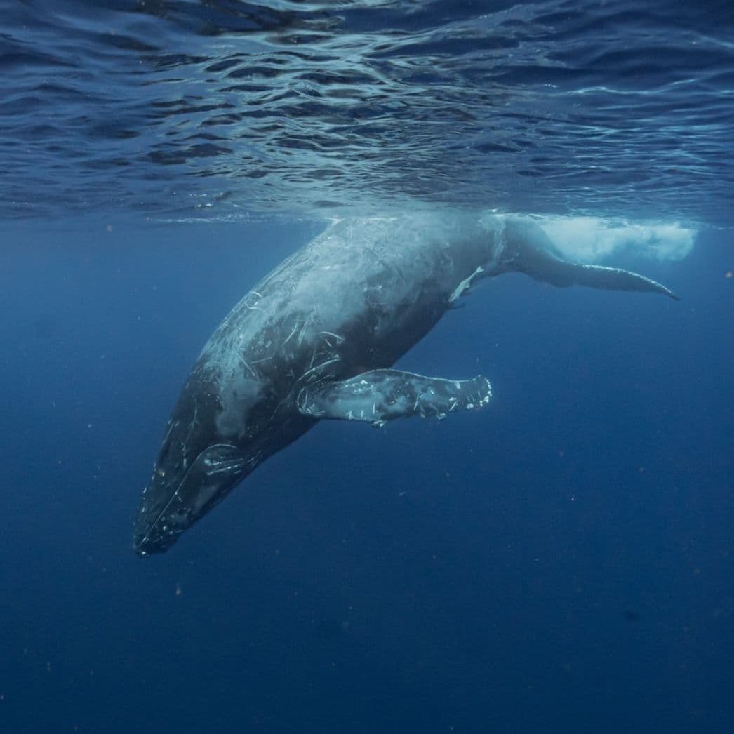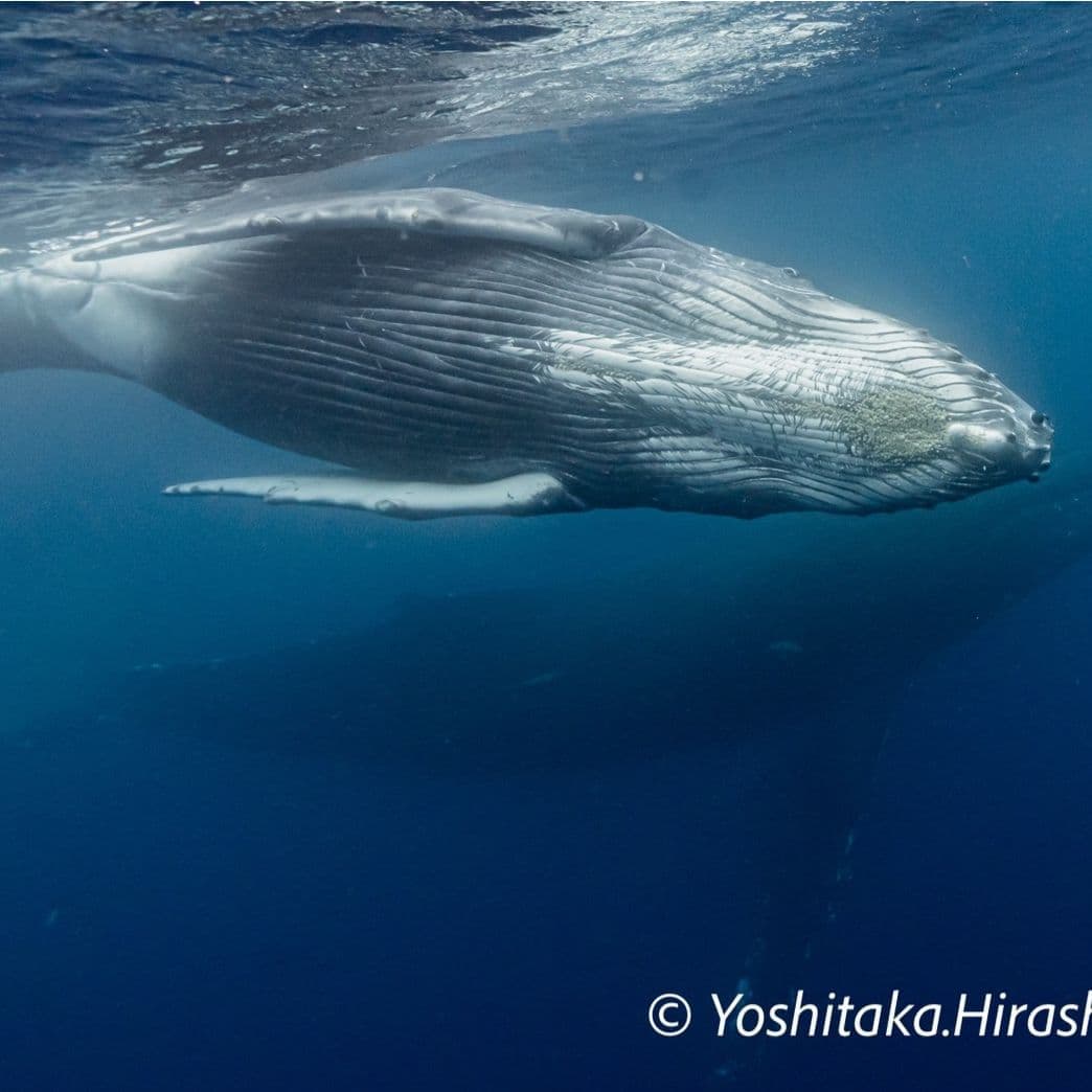 水面からスノーケルでザトウクジラを見る事が出来る。親子を見る事も多い。シンガーで水中で鳴いてるクジラを体感出来る。水中で見るザトウクジラは感動を与えてくれる。(どの個体でも泳げるとは限らない。泳げない個体群の方が多いと思って頂ければと思う)