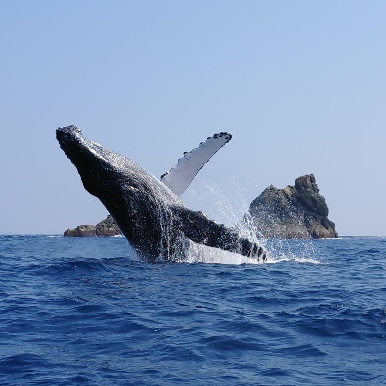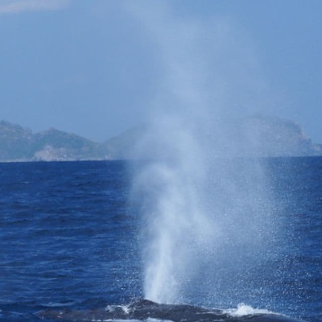 噴気、呼吸のため、水面に浮上した時に息を吐く行動。白い霧状で3~5mも吹き上がる。写真を撮るには朝早い時間に島をバックに撮るとブロウがハッキリしてとてもキレイ。(ブロウは浮上して2~6回ほど行うのでその時がチャンス)