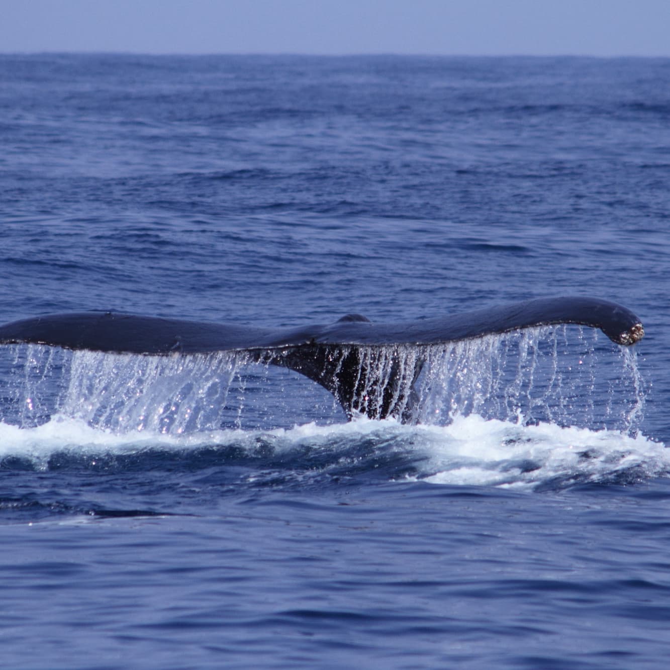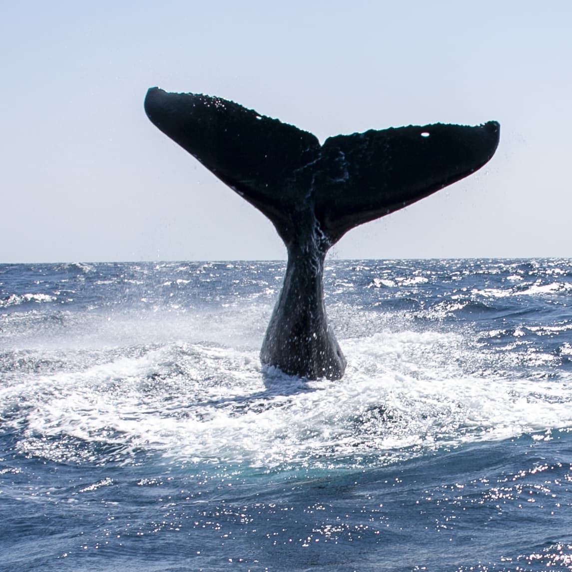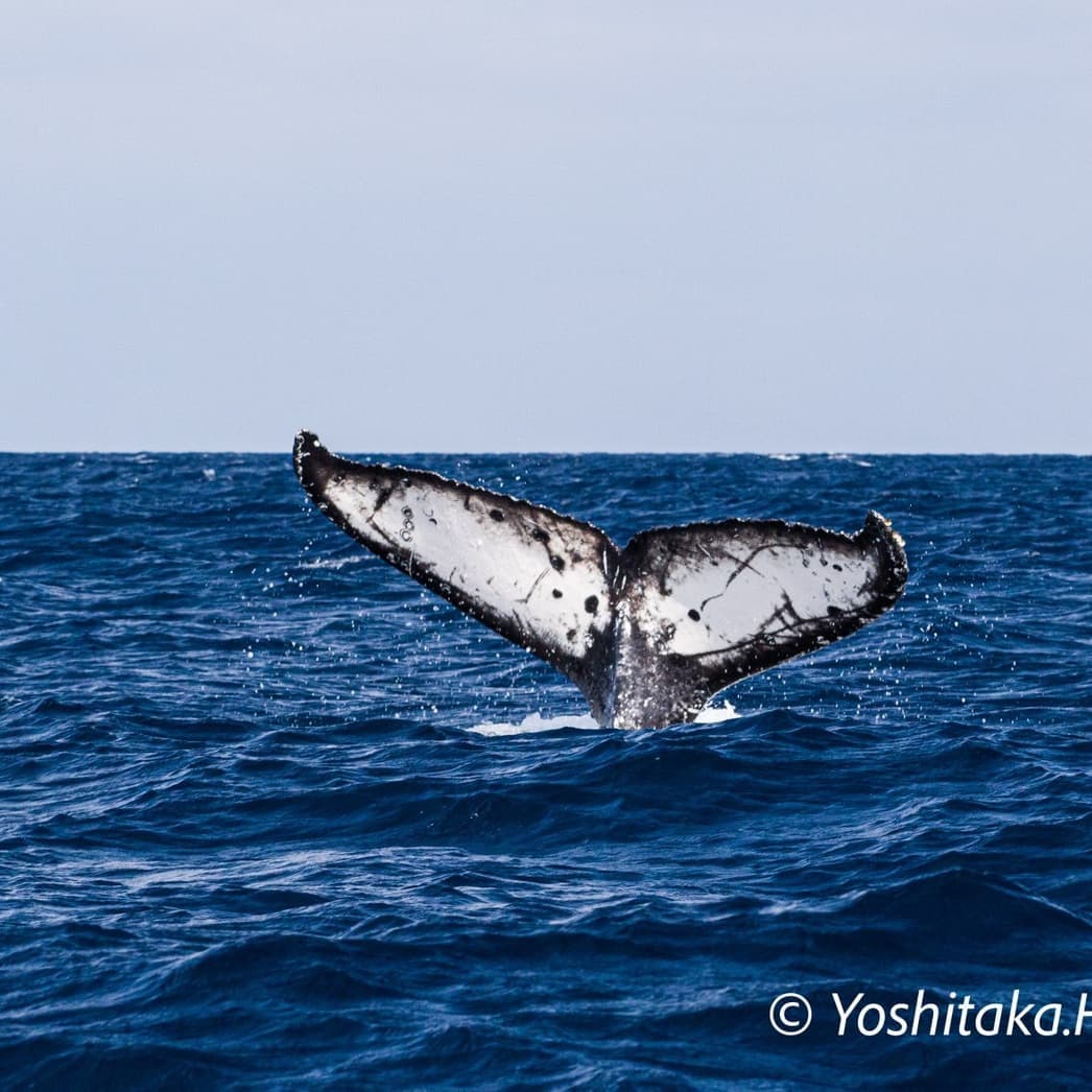 何度かブロウを繰り返した後、テールを水面上に高く上げて潜る行動。テールが上がると次の浮上まで時間がかかる。その時に尾ビレから流れ出る海水を入れて撮るのもGood。(尾ビレの模様がクジラによって全て違う、ザトウクジラの個体識別に使われています)