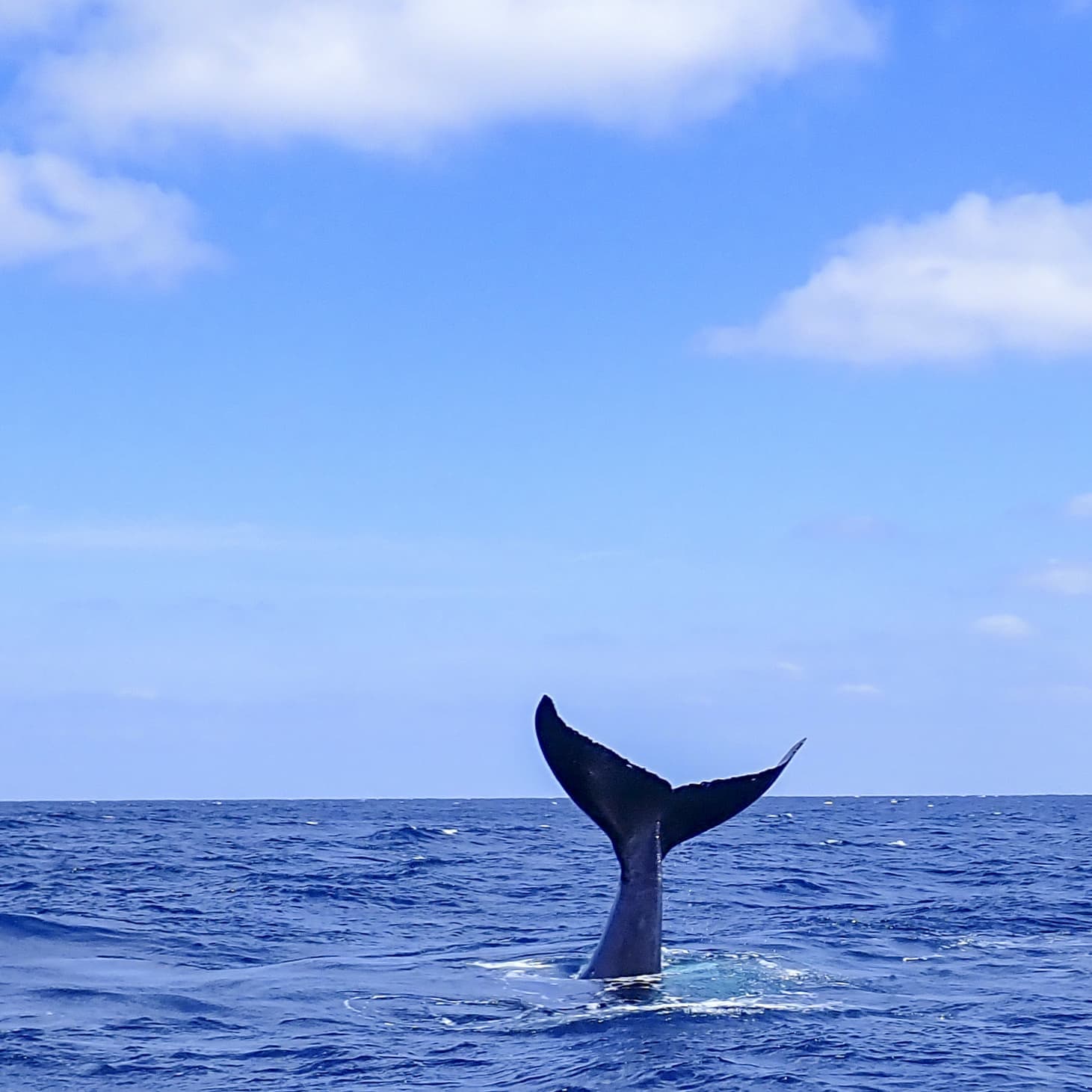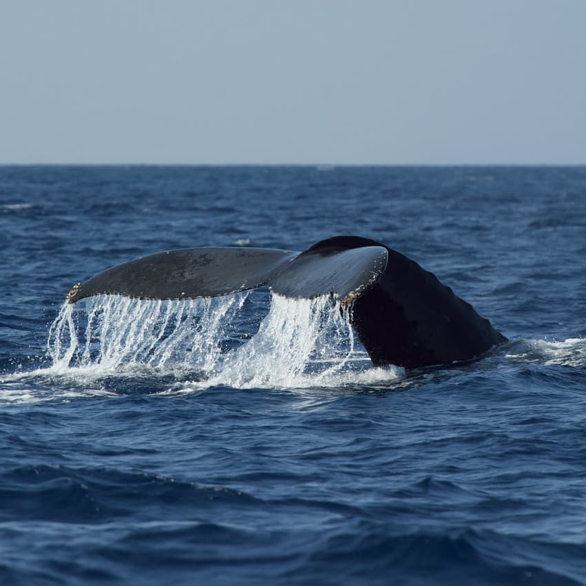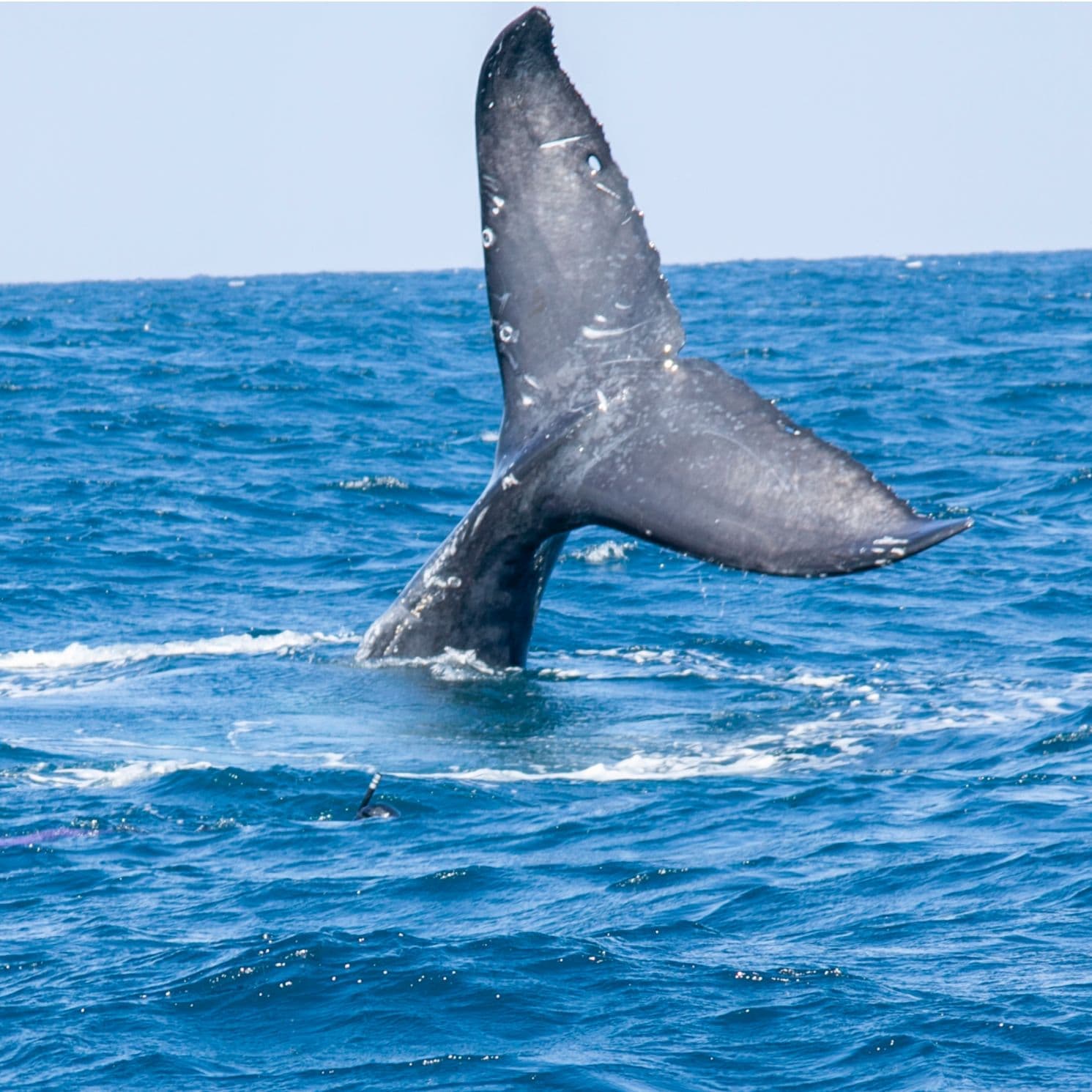 何度かブロウを繰り返した後、テールを水面上に高く上げて潜る行動。テールが上がると次の浮上まで時間がかかる。その時に尾ビレから流れ出る海水を入れて撮るのもGood。(尾ビレの模様がクジラによって全て違う、ザトウクジラの個体識別に使われています)