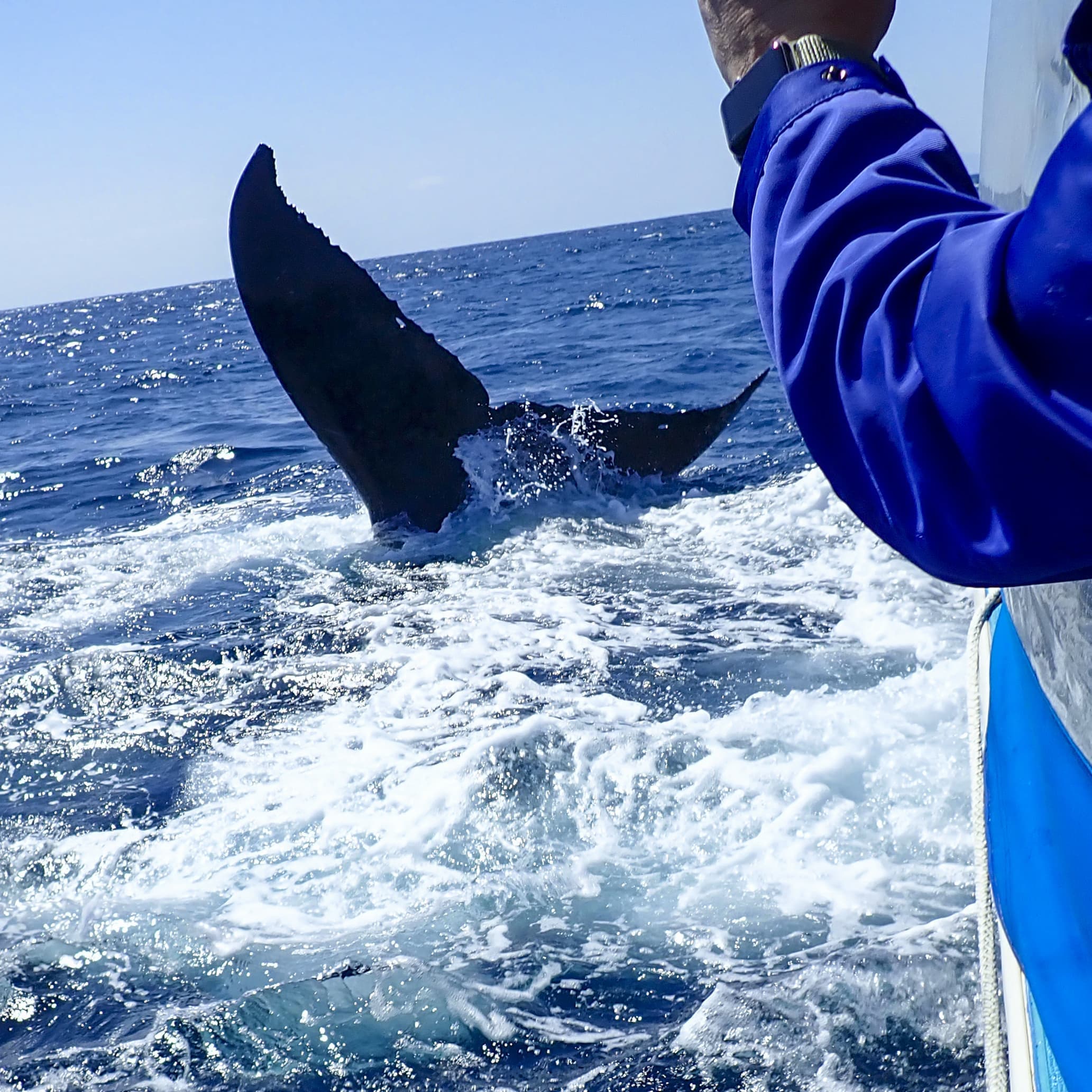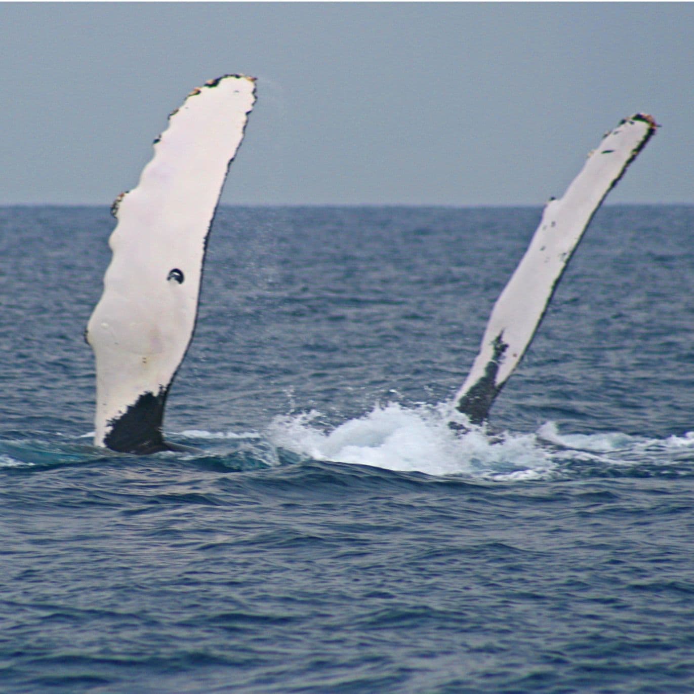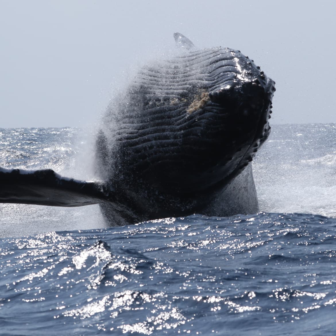 海面近くで逆立ちをするかのように尾ビレを空高く上げ、力一杯水面に叩き付ける行動。(5回以上も連続して行う時もあるので、ぜひ撮ってほしいカットです)