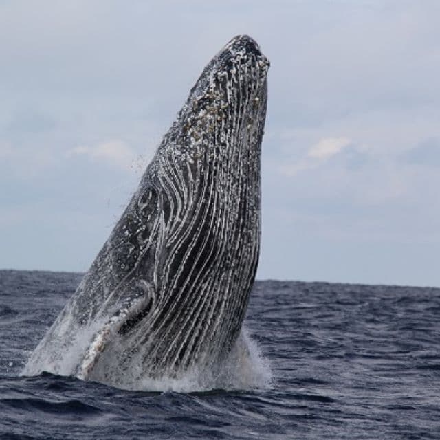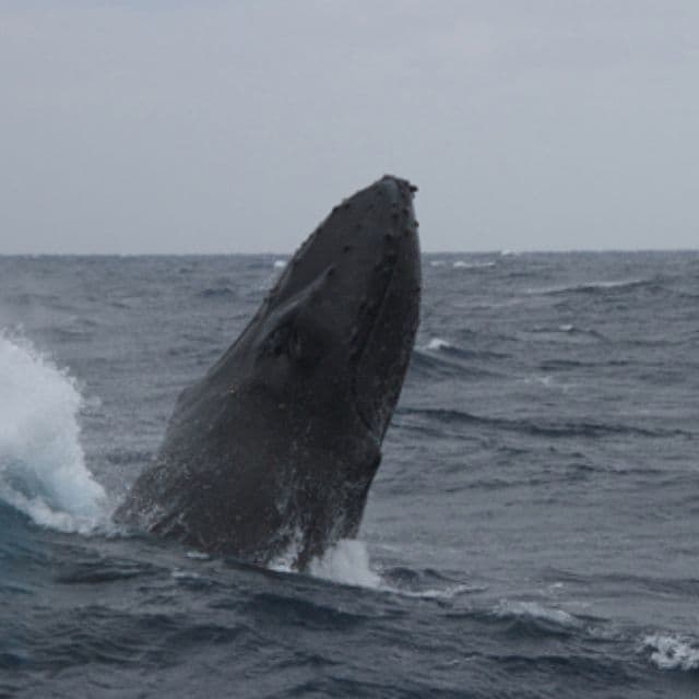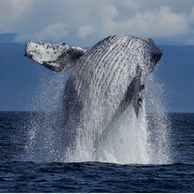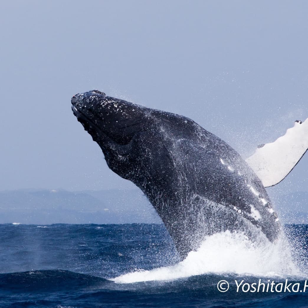 クジラの中でもよくジャンプするザトウクジラ。13m、30トンの巨体が水面上に跳び上がり、語らダの上半分から時には全身を水面上に出す大迫力な行動。是非撮ってほしいショットである。(一度ブリーチを始めたら何度も繰り返し行う)